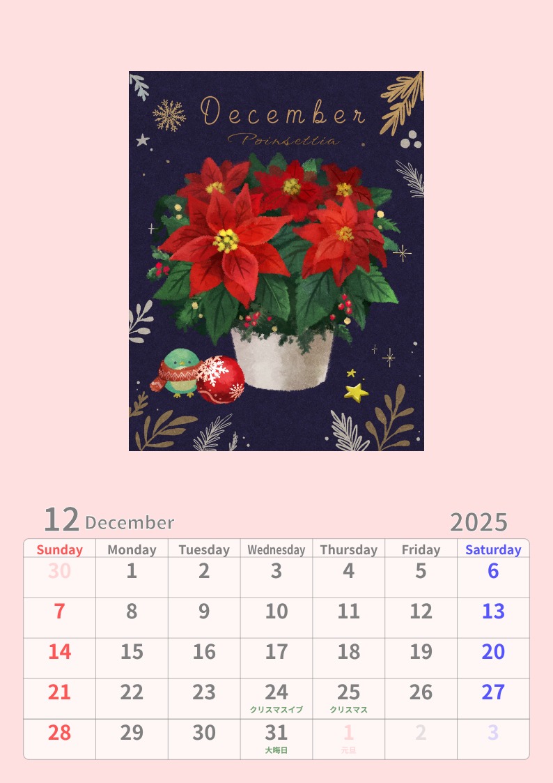 ご訪問ありがとうございます。早いもので今年も残り一ヶ月となりました。今年最後のカレンダーを描いて頂きましたのでご覧くださいませ!!